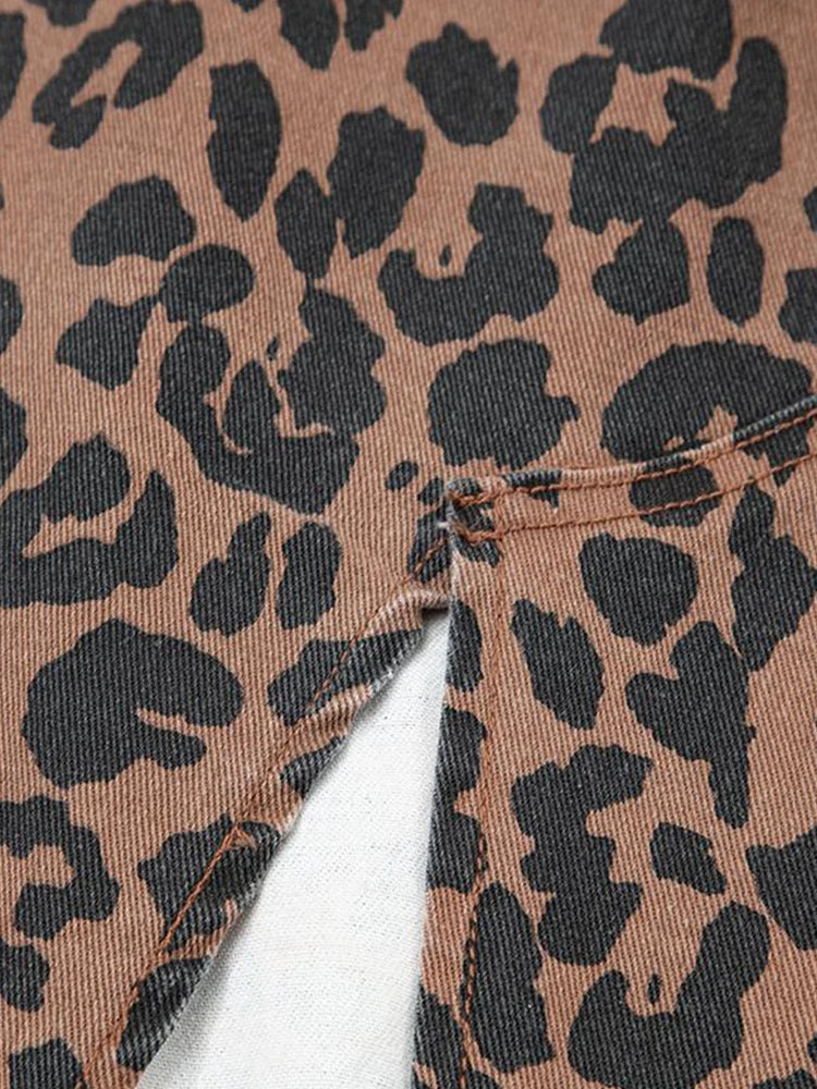 Women's High-Waisted Leopard Print Denim Skirt with Slit